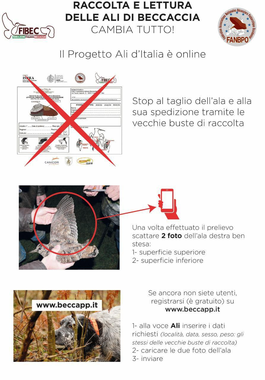 Dalla stagione 2025/2026, stop al taglio dell’ala destra della beccaccia e alla sua spedizione con le apposite buste di raccolta. La moderna tecnologia digitale consente una rivoluzione che velocizzerà e migliorerà il Progetto Ali d’Italia, in vigore da oltre vent’anni. Bastano 4 semplici passi