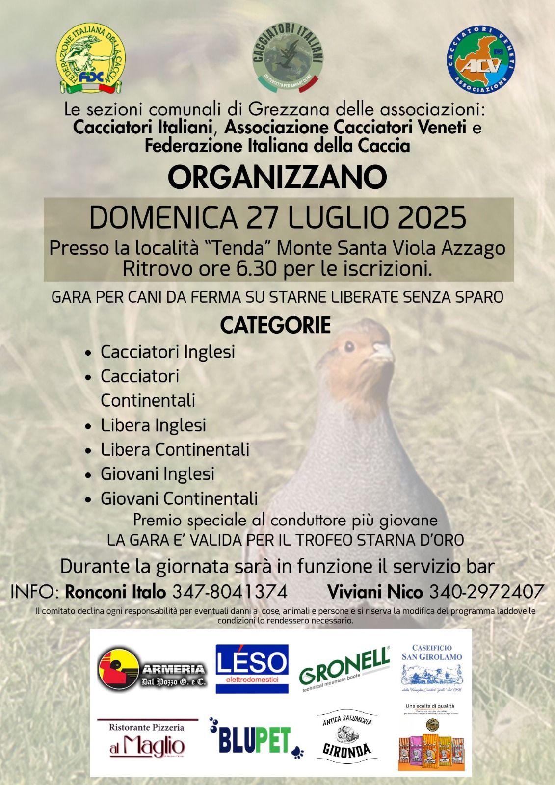 | 27.07.2025 | Cacciatori Italiani, ACV e FIDC sezioni di Grezzana | Gara per cani da ferma su starne liberate senza sparo |